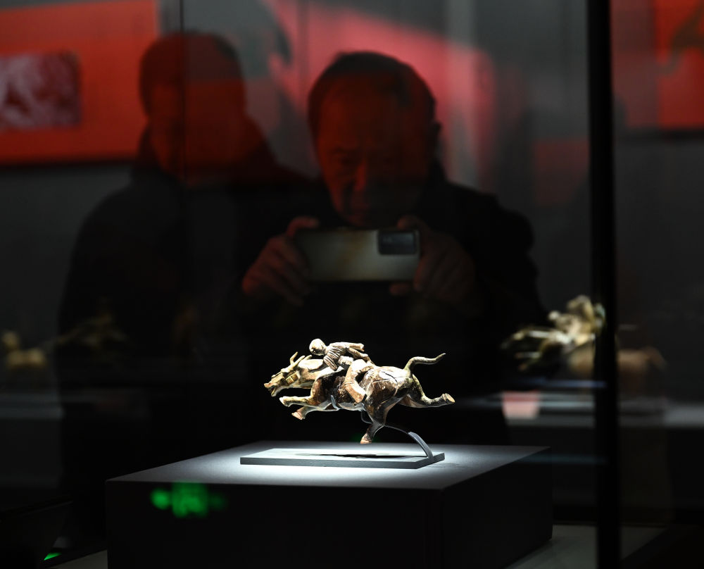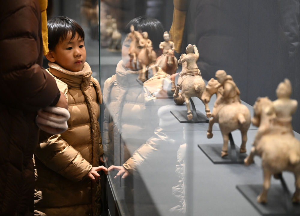 1月1日,市民在郑州大象陶瓷博物馆观看汉代绿釉勇士骑飞奔马俑。记者 李嘉南 摄