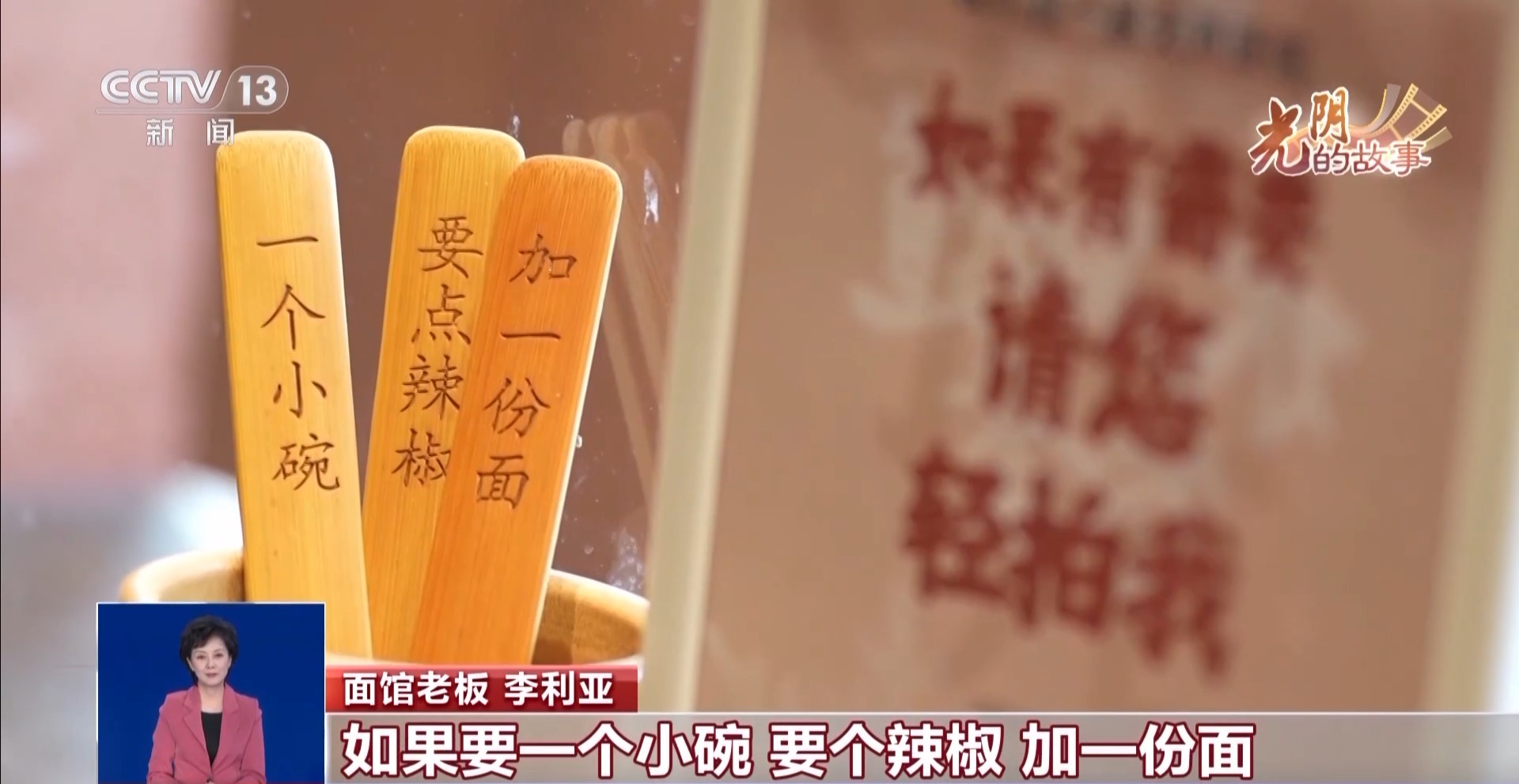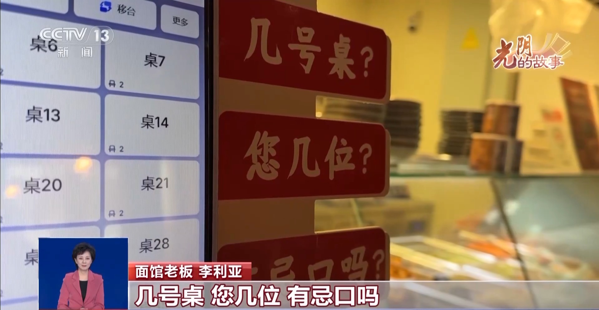 面馆老板李利亚:在收银机旁边有几个提示语,还有桌面竹签,如果想要个小碗,要辣椒或加一份面,把它拿给服务员,服务员就知道了。