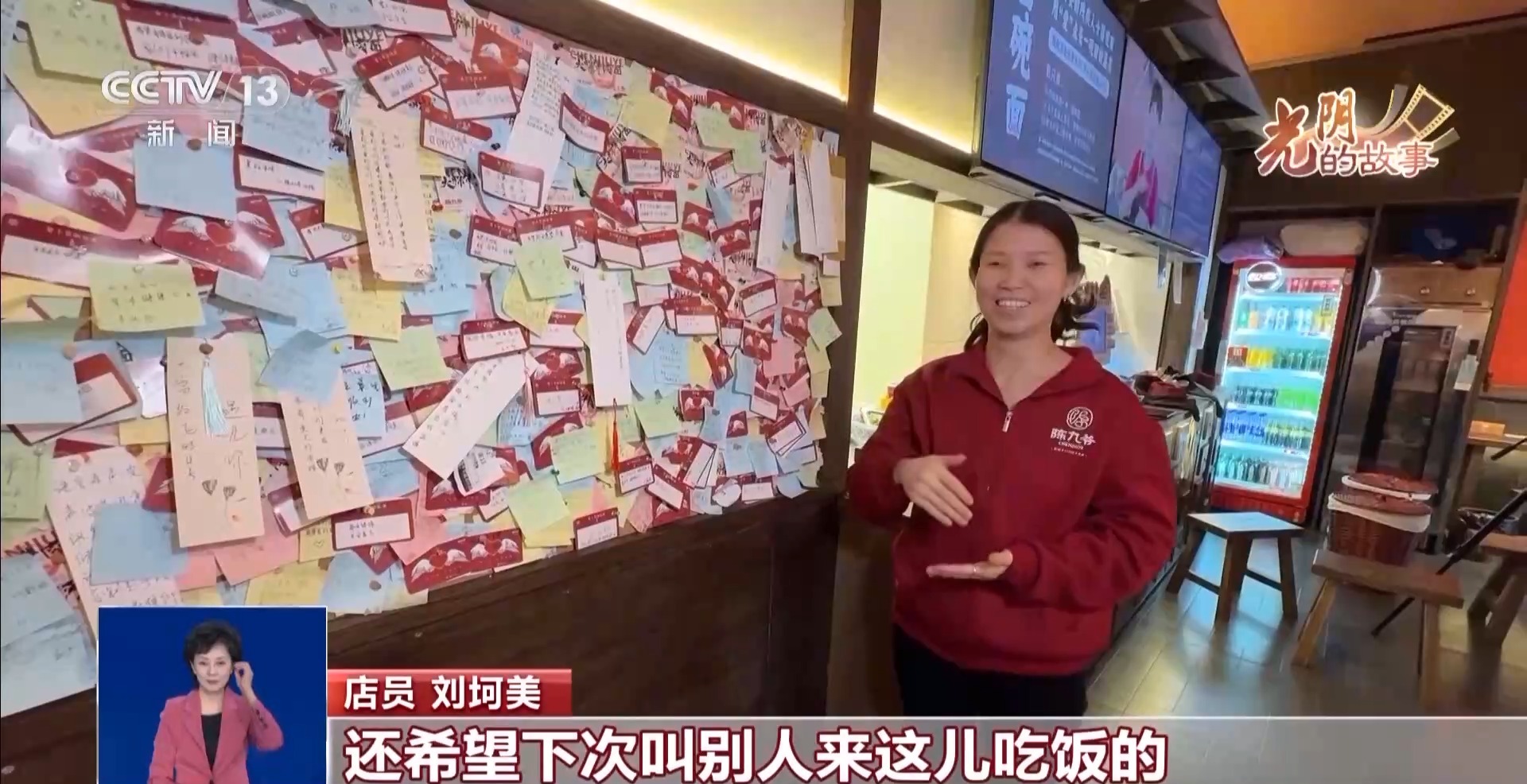 店员刘坷美:说她们服务特别好,还希望下次叫别人来这吃饭的,来这儿留作纪念,他们把便签放上去之后,感觉特别开心。
