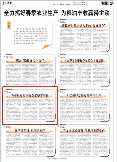 河南省委、省政府把保障粮食安全作为建设农业强省的头等大事,强化藏粮于地、藏粮于技,抢农时抓田管、挖潜力提产能。据调度,今年冬小麦面积在8500万亩以上,一二类苗比例94.4%,是近年来最好水平,为夺取夏粮丰收奠定坚实基础。
