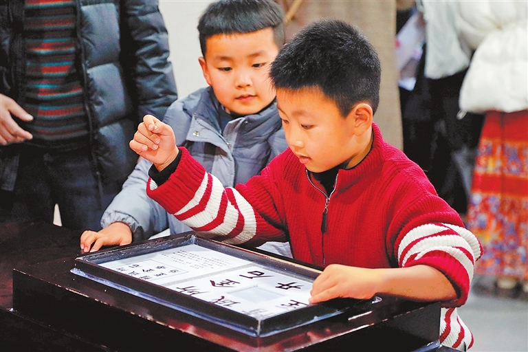 孩子们在中国文字博物馆体验文字华容道游戏。记者 杨之甜 摄