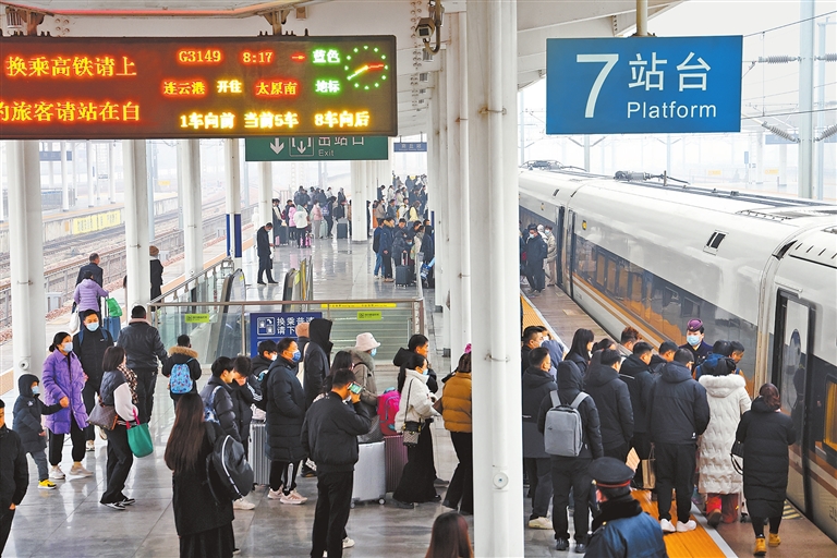 2月15日,商丘站迎来客流高峰。该站加强站台乘降组织,确保旅客有序上车。(邢栋 摄)