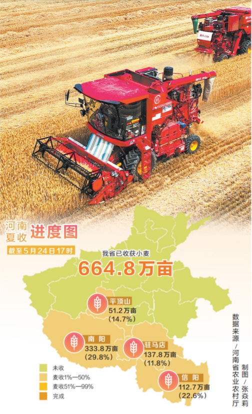 据省农业农村厅统计,截至5月24日,全省8500万亩小麦已收获664.8万亩,超过了500万亩的临界点,标志着全省小麦机收大会战打响,“中原粮仓”正式拉开麦收大幕。