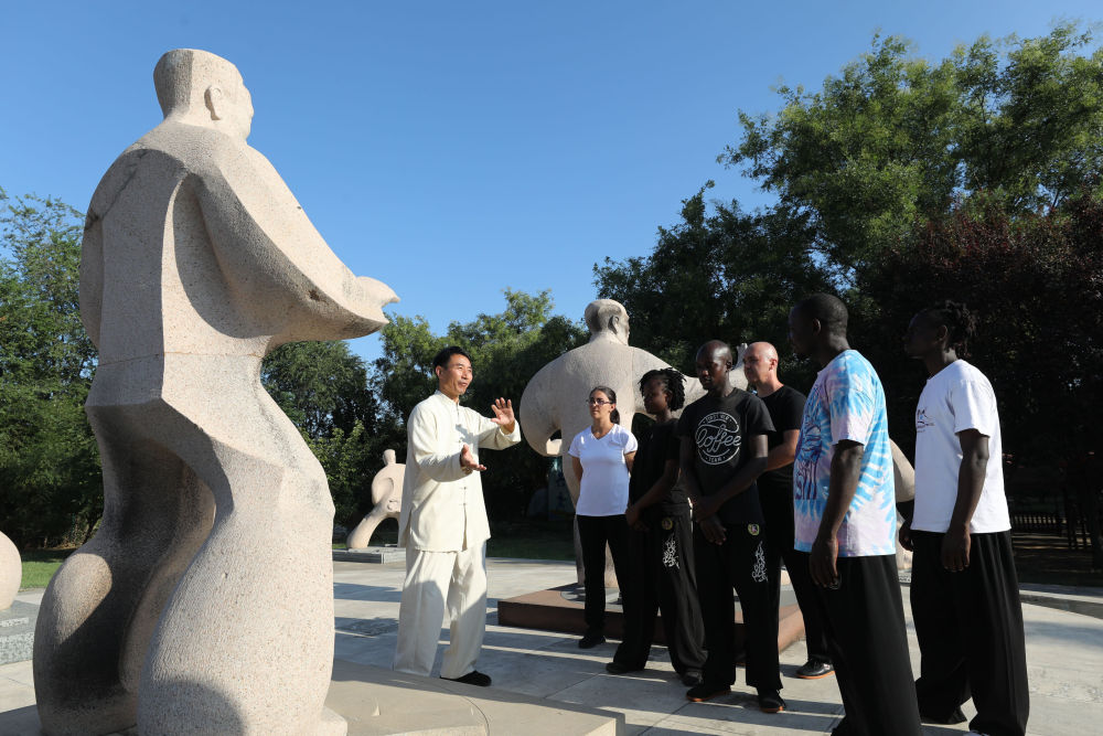 9月6日,在河南省焦作市温县陈家沟太极十三式雕塑广场,太极拳师陈炳为外籍学员讲解太极文化。新华社发(徐宏星 摄)