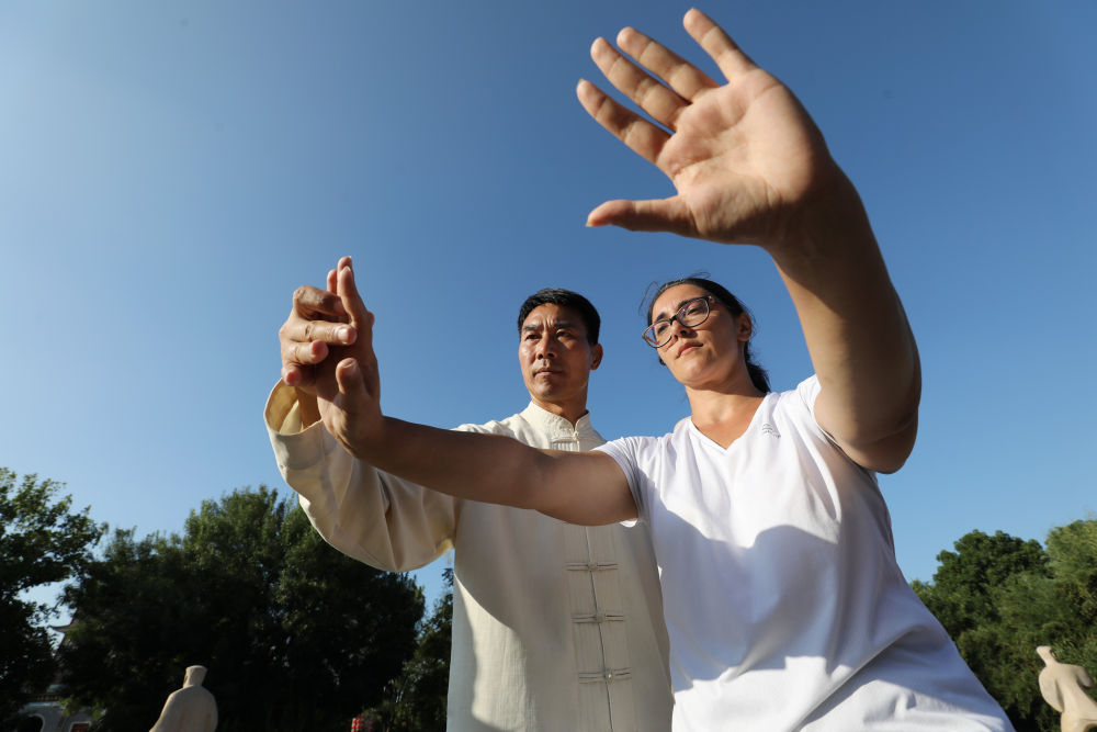 9月6日,在河南省焦作市温县陈家沟太极十三式雕塑广场,太极拳师陈炳在指导外籍学员练习太极拳。新华社发(徐宏星 摄)
