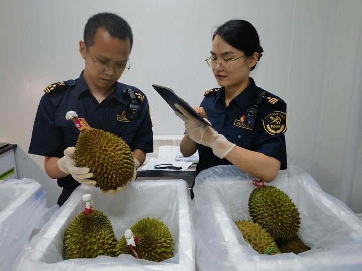 2024年8月24日,郑州机场海关工作人员正在查验首批进入中国市场的马来西亚鲜食榴莲。(新华社发)