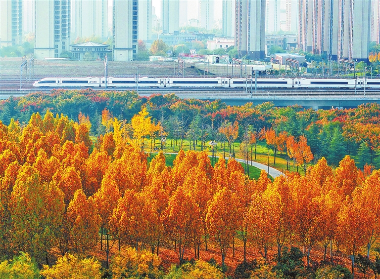 11月5日,一列高铁列车经过郑州市郑东新区高铁公园。列车沐浴在秋色中,美如画卷。 记者 王铮 摄
