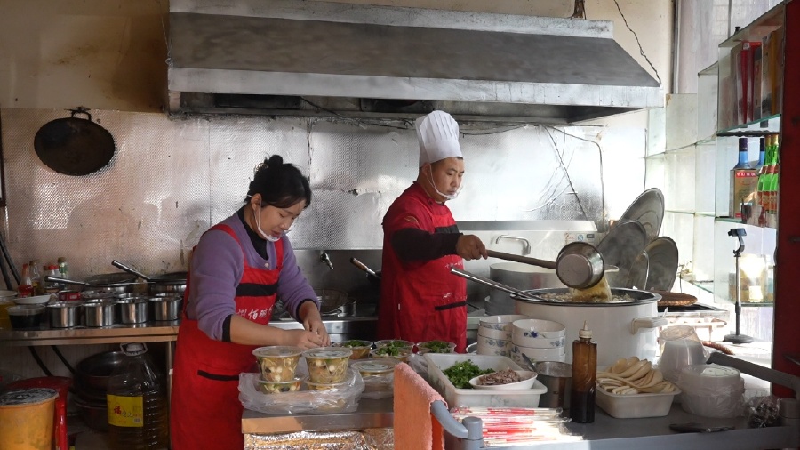 店主周朝奎忙着准备食材,妻子李玲玲则在一旁打扫卫生,为即将到来的午市做准备。