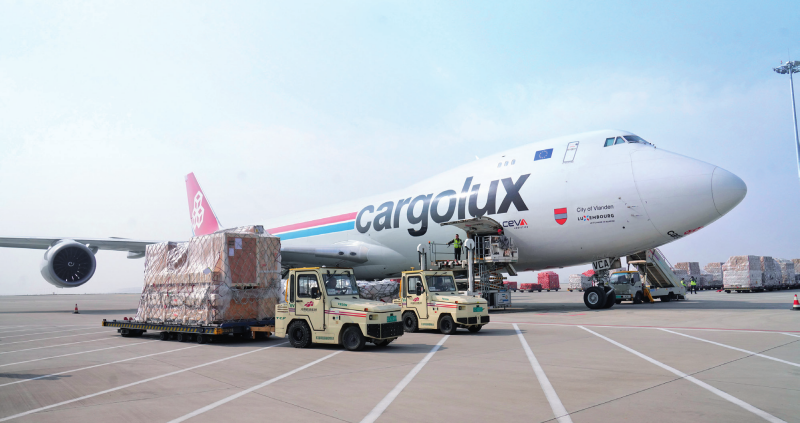 一架卢森堡货航的货机在郑州机场装卸货物(2025年11月4日摄)中豫航空集团供图