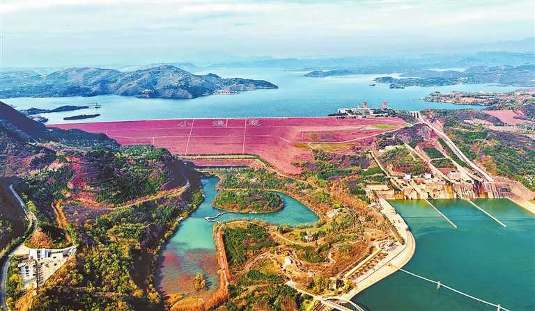 11月24日,位于洛阳市孟津区的黄河小浪底水利枢纽周边山峦起伏、色彩斑斓,下游河道绿水潺潺,成为冬日里的一道亮丽风景线。 郑占波 马绍磊 摄