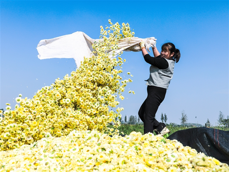 新蔡县龙口镇菊花园,村民晾晒菊花。邵青峰 摄