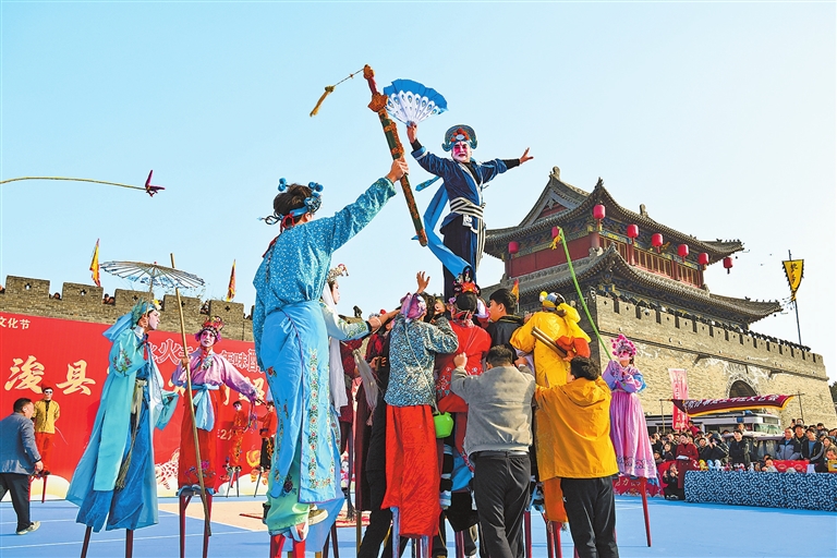 浚县古城墙下“社火村超”高跷晋级赛表演正酣