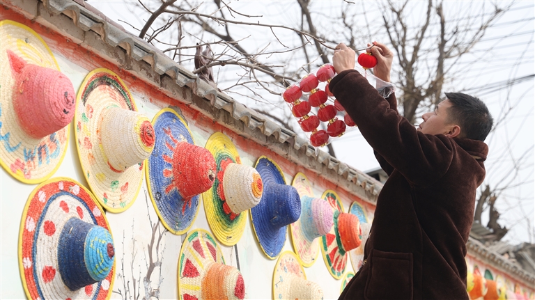 2月11日,在柘城县牛城乡韩庄村,村民正忙着在村街的树枝上悬挂红灯笼。一旁的墙面上,色彩斑斓的手绘草编帽整齐排列,与红彤彤的灯笼相映成趣。张超 摄