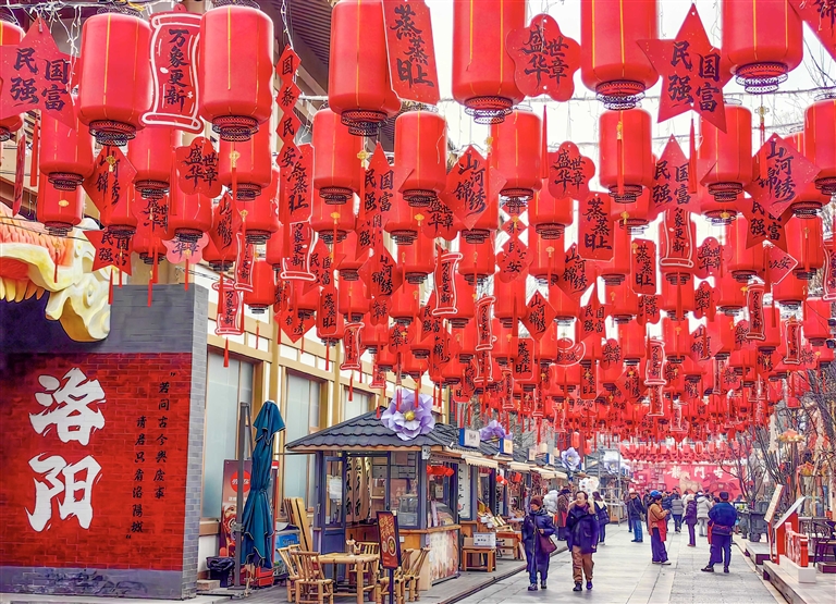 2月10日,洛阳龙门石窟景区内张灯结彩,营造出喜气祥和的节日氛围。 张怡熙 章杰 摄