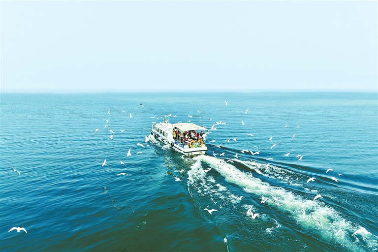 3月10日,淅川县丹江口水库,成群的红嘴鸥围绕在游船旁翱翔,仿佛在与船只共舞。这里已成为今春热门打卡地,吸引了众多游客前来观赏和拍照。孙怡斐 摄